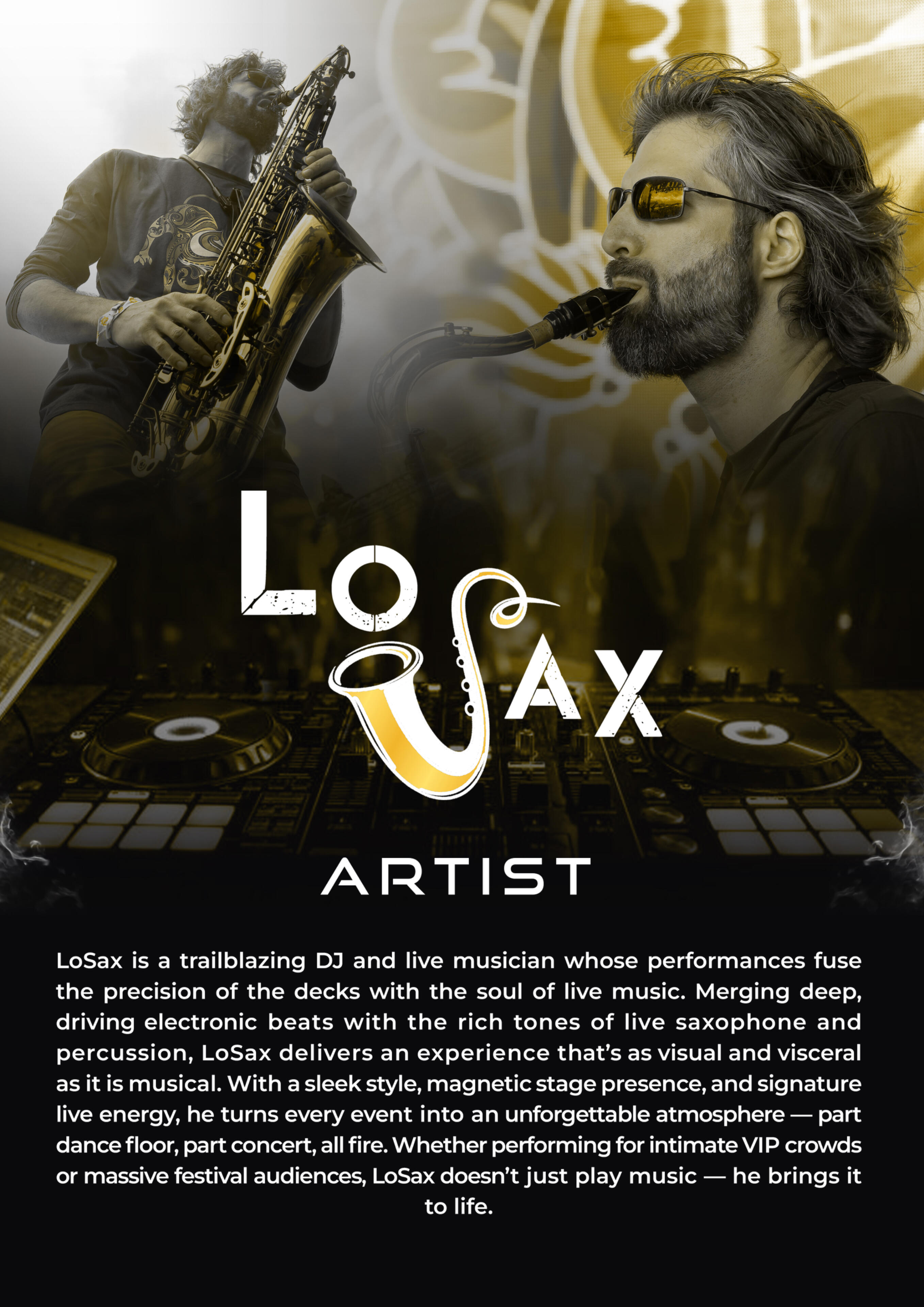 LoSax is a trailblazing DJ and live musician whose performances fuse the precision of the decks with the soul of live music. Merging deep, driving electronic beats with the rich tones of live saxophone and percussion, LoSax delivers an experience that’s as visual and visceral as it is musical. With a sleek style, magnetic stage presence, and signature live energy, he turns every event into an unforgettable atmosphere — part dance floor, part concert, all fire. Whether performing for intimate VIP crowds or massive festival audiences, LoSax doesn’t just play music — he brings it to life.